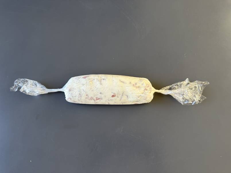 Die Mischung zu einem festen Strang aufrollen. Etwa 30 Minuten im Kühlschrank ruhen lassen oder bis der Stollen fest ist.