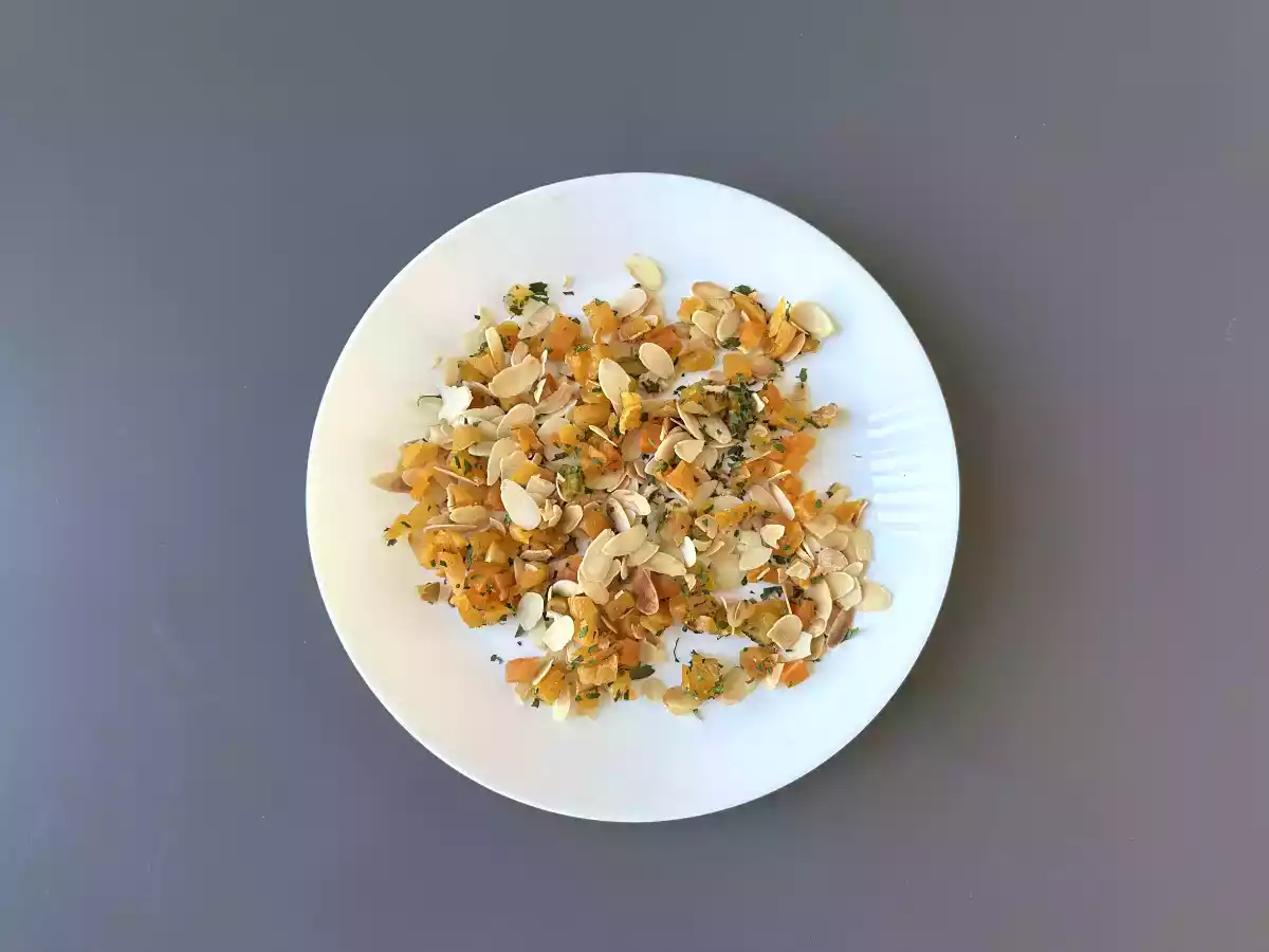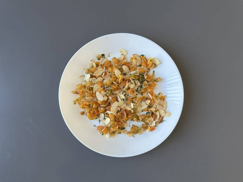 Auf einem Teller die geschnittenen Aprikosen, die gerösteten Mandeln und die Petersilie vermischen.