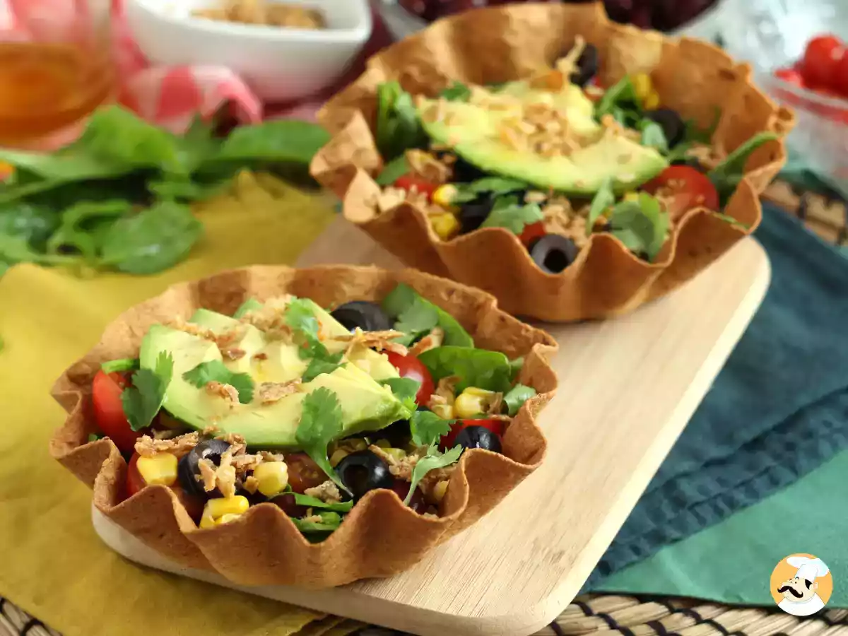 Mit dieser Präsentation werden Ihre Salate nie wieder dieselben sein! Bereiten Sie tolle Körbe aus Weizentortillas zu. Dazu benötigen Sie die typische tulpenförmige Tortenform. Legen Sie die Pfannkuchen hinein, backen Sie sie kurz im Ofen und schon sind sie fertig. Eine schöne Schale, die wir mit den Zutaten füllen können, die wir am liebsten mögen. Einfach, lecker und sehr originell.