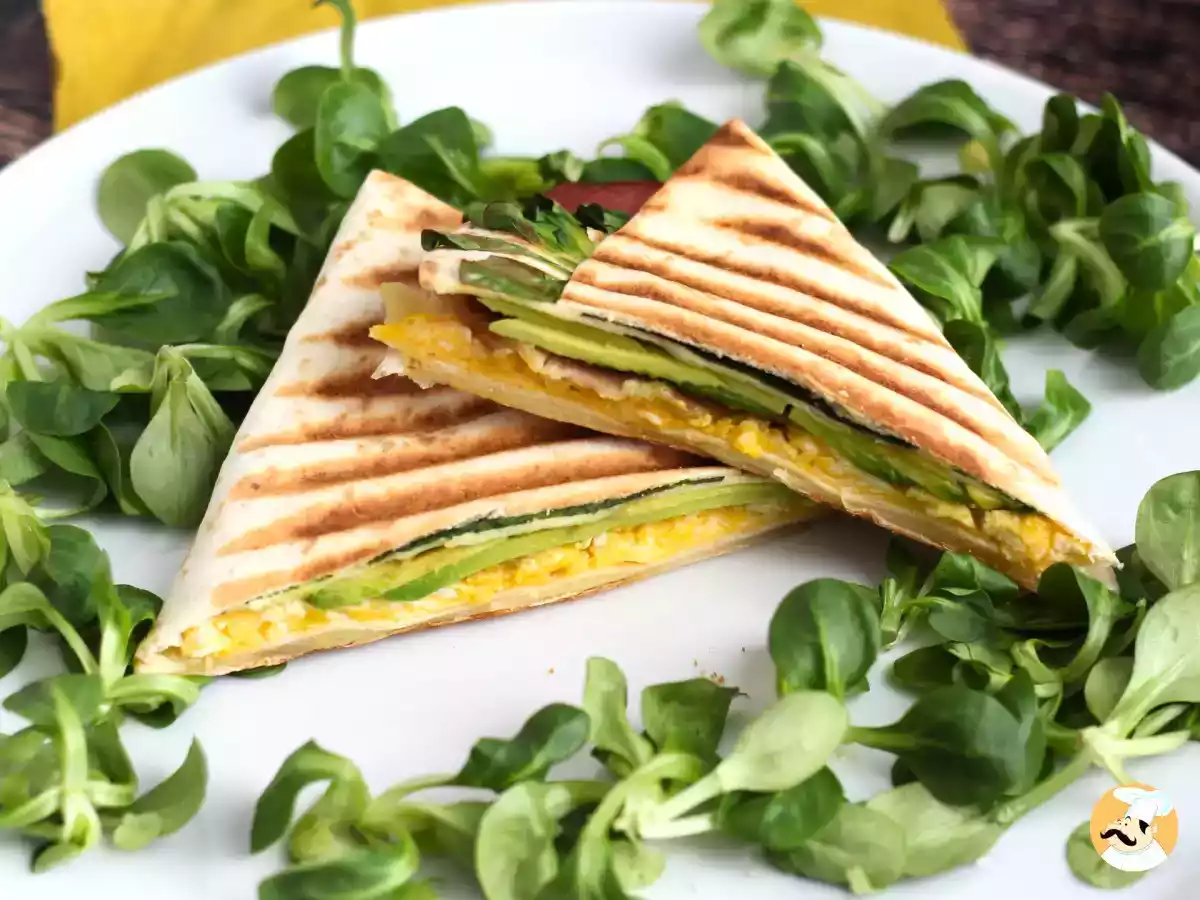 Legen Sie die Schnittseite nach unten (so lässt sie sich leichter falten). Geben Sie nun die verschiedenen Zutaten in jedes der Omelett-Viertel. Jetzt müssen Sie die Tortilla nur noch zusammenfalten und wieder auf sich selbst legen. Sie können den Tortilla-Wrap in einem Sandwichmaker rösten, bis die Außenseite goldbraun ist. Wenn du keinen Sandwichmaker hast, kannst du sie auch in einer mit etwas Butter eingefetteten Pfanne rösten. Und das war's!