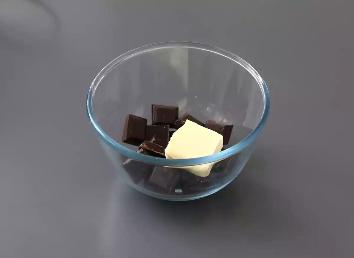 Schmelzen Sie die dunkle Konditorschokolade und die Halbsalzbutter im Wasserbad oder in der Mikrowelle.