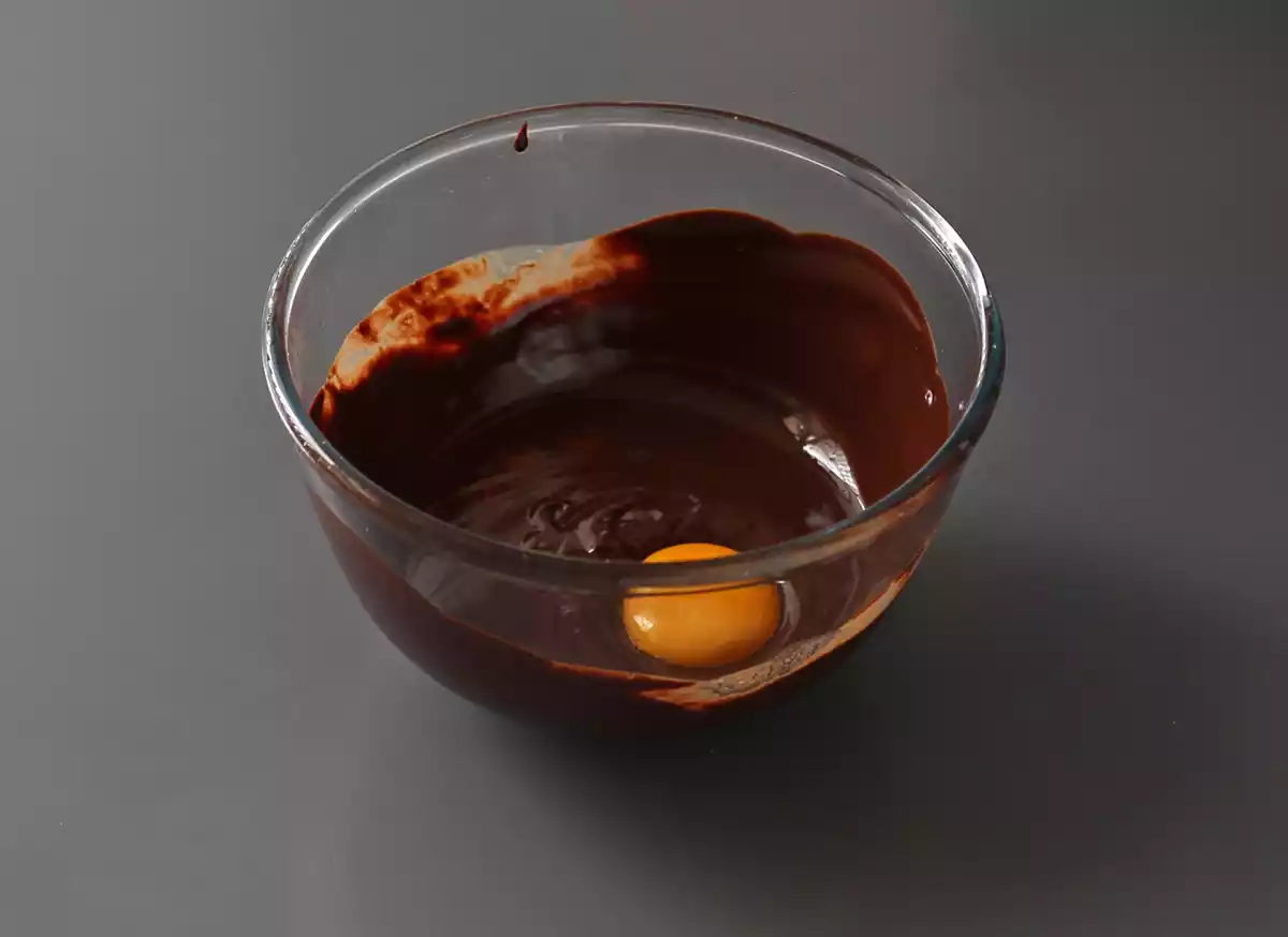 Das Eigelb in die Mischung aus Schokolade und geschmolzener Butter geben.