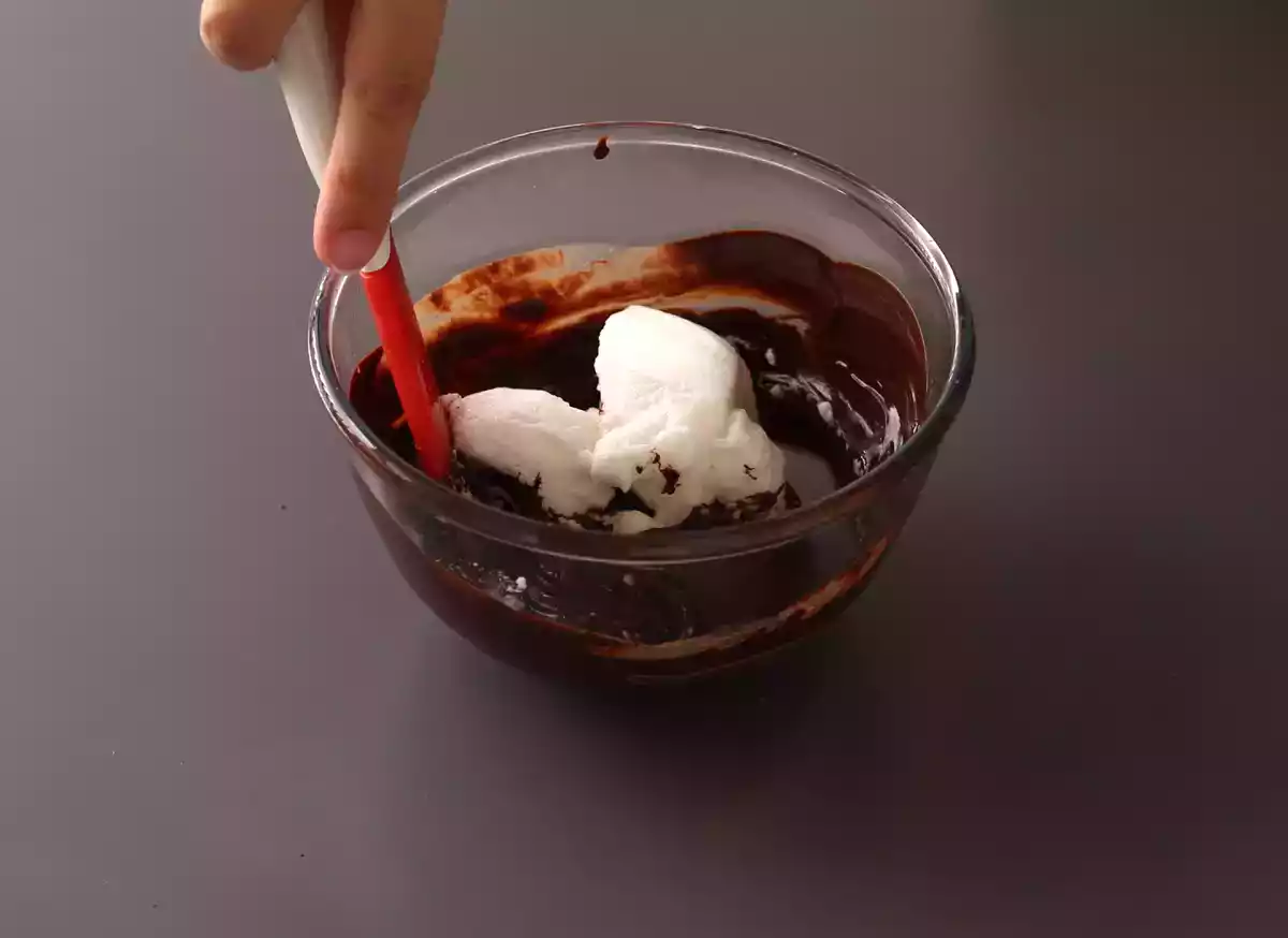 Anschließend das steif geschlagene Eiweiß in mehreren Schritten vorsichtig mit einer Maryse unterheben.