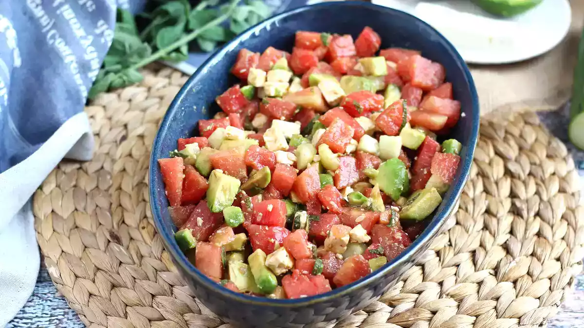 Dieser erfrischende, farbenfrohe und kontrastreiche Salat vereint die Süße der Wassermelone, die Cremigkeit der Avocado, die Knackigkeit der Gurke und die salzige Schärfe des Feta-Käses. Er ist nicht nur eine Explosion der Aromen und Texturen, sondern auch ein großartiger Verbündeter für eine ausgewogene Ernährung, besonders an heißen Tagen.