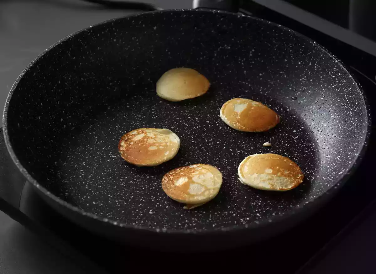 Die Bratpfanne einfetten und auf mittlerer Stufe erhitzen. Sobald sie heiß genug ist, für jeden Blini 1 Teelöffel Teig hineingeben, oder eine größere Menge, wenn Sie es vorziehen.