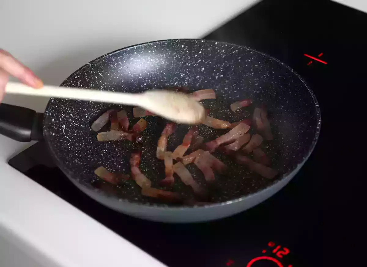In einer Bratpfanne ohne Zugabe von Fett anbraten. Es ist fertig, wenn es glasig und leicht knusprig ist (Vorsicht, nicht zu lange kochen).