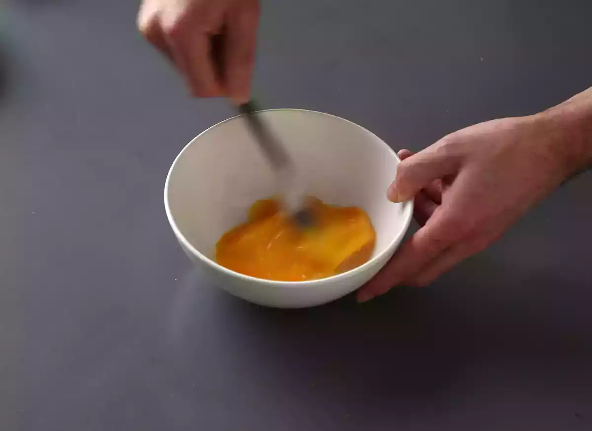 Ein ganzes Ei und ein Eigelb in eine Schüssel geben. Alles wie für ein Omelett verquirlen.