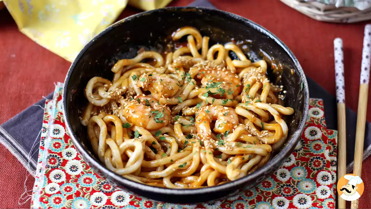Wenn Sie von einem orientalischen Gericht träumen, das Ihr Herz (und vielleicht auch ein bisschen Ihren Mund!) erwärmt, aber nicht stundenlang am Herd stehen wollen, ist dieses Rezept genau das Richtige für Sie! Udon mit Garnelen und pikanter Erdnusssauce (ausführliches Rezept hier) sind eine Geschmacksexplosion, die Sie sofort überzeugen wird. Sie lassen sich im Handumdrehen zubereiten!