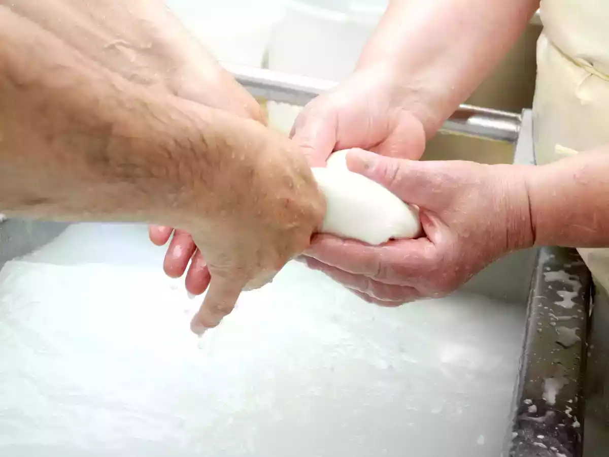 Um den Wassergehalt des Mozzarellas, insbesondere wenn er in Scheiben geschnitten ist, schnell und deutlich zu reduzieren, kann er mit der Hand ausgepresst werden.