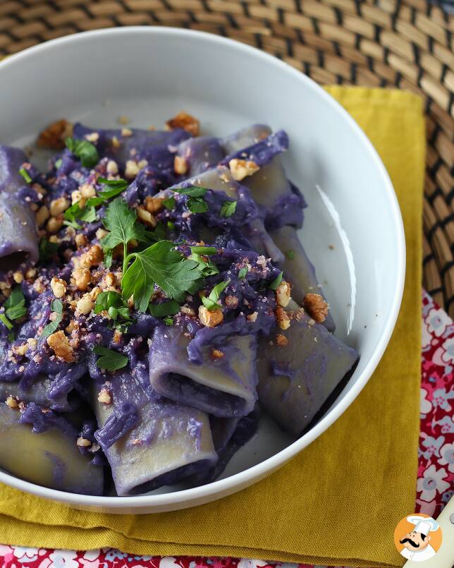Farbenfroh, einfach und überraschend: Pacchero mit Rotkohl und Walnüssen ist eines dieser ersten Gerichte für das Osteressen, die Geschmack und Originalität vereinen. Der Rotkohl verleiht dem Gericht eine lebendige Farbe, während die Walnüsse das Gericht mit einem angenehmen Knacken abrunden. Ein einfaches Rezept, das sich auch mit anderen Nudelformen abwandeln lässt und perfekt ist, um beim Osteressen eine kreative Note auf den Tisch zu bringen.