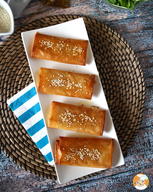 Das griechische Rezept heißt Feta Saganak i und ist sehr einfach und preiswert. Alles, was Sie für die Zubereitung dieser Feta-Röllchen brauchen, sind 4 Blätter Filoteig, etwas geschmolzene Butter, Pfeffer, Feta, Sesam und Honig. Das Ergebnis ist eine köstliche und überraschende Vorspeise, bei der sich der Fetakäse in dem knusprigen Teig mit der Süße des Honigs und dem Geschmack der Sesamsamen wunderbar vermischt. Die schnelle Zubereitung und die geringen Kosten von weniger als 2 Euro pro Person machen dieses Rezept ideal für einen besonderen Anlass, aber auch für ein einfaches, aber leckeres Mittag- oder Abendessen. Der Saganaki-Feta überzeugt durch sein perfektes Gleichgewicht der Geschmacksrichtungen!