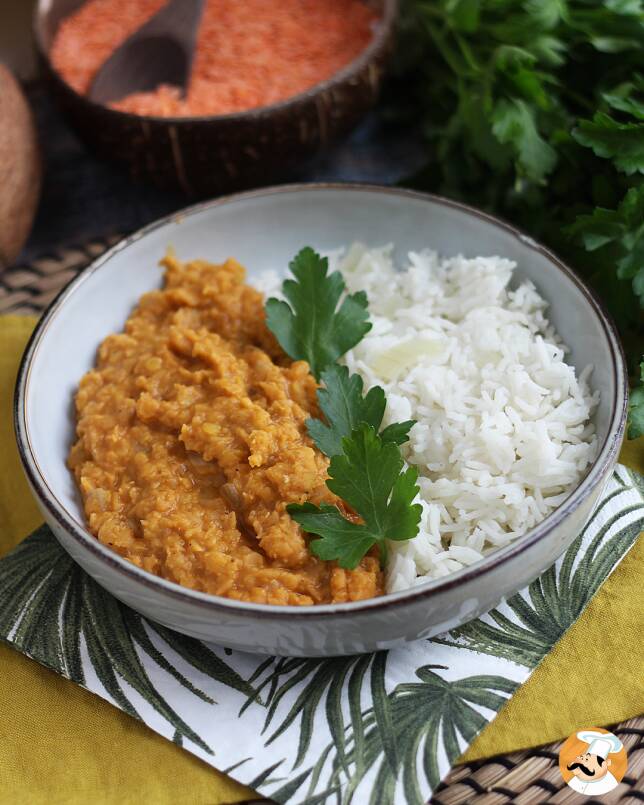 Linsen-Dahl ist ein Gericht, das reich an pflanzlichem Eiweiß ist, perfekt für alle, die eine nahrhafte und sättigende Alternative suchen. Dank der Linsen bietet dieses Rezept eine hervorragende Eiweißversorgung, ideal zur Unterstützung des muskulären und energetischen Wohlbefindens. Cremig, würzig und umhüllend ist es eine köstliche Wahl für alle, die Geschmack und Ernährung in einem Gericht vereinen möchten !