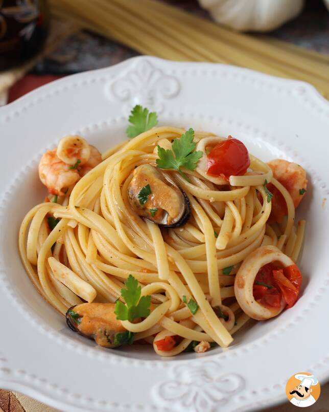 Mal ehrlich: Wer hat nicht immer eine tiefgekühlte Meeresfrüchte-Mischung im Gefrierschrank parat? Ein echter Trumpf für Last-Minute-Dinner, mit dem man im Handumdrehen einen ersten Gang mit Meeresfrüchten zubereiten kann. Wir haben uns für Linguine entschieden, aber Sie können sich auch für Spaghetti oder frische lange Nudeln entscheiden, je nach Ihrem Geschmack. Nudeln mit tiefgefrorenen Meeresfrüchten sindeine praktische und köstliche Idee, um ein spontanes Abendessen in einen Moment des Genusses zu verwandeln.