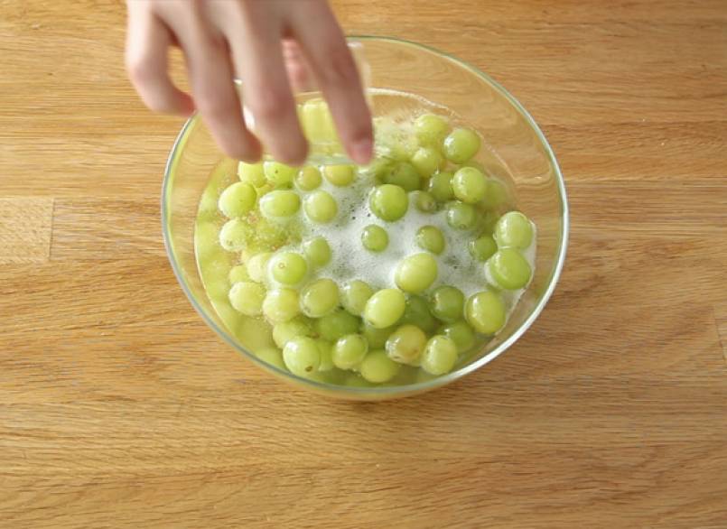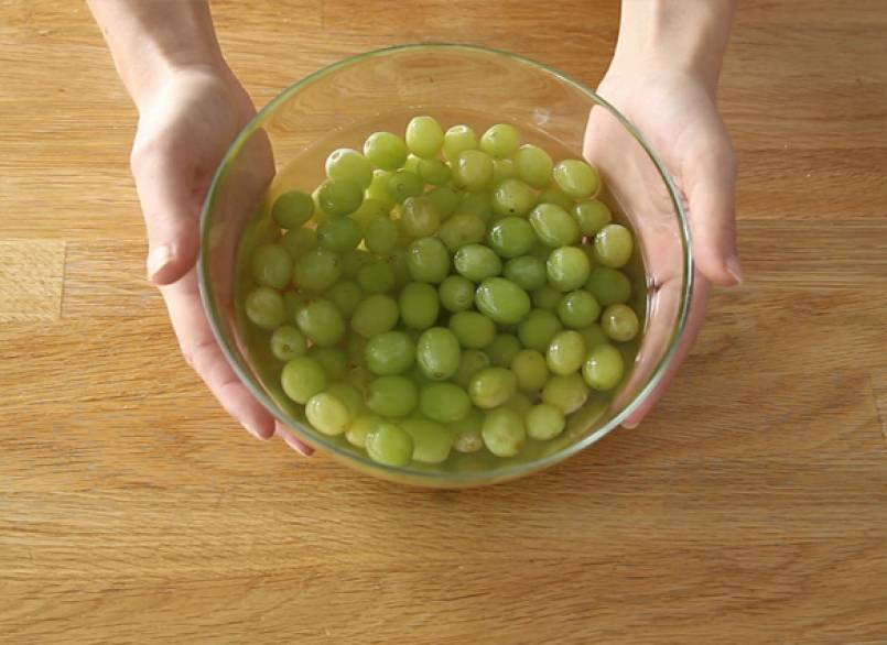 Die gewaschenen Weintrauben in eine Schüssel geben. Den Prosecco dazu gießen.