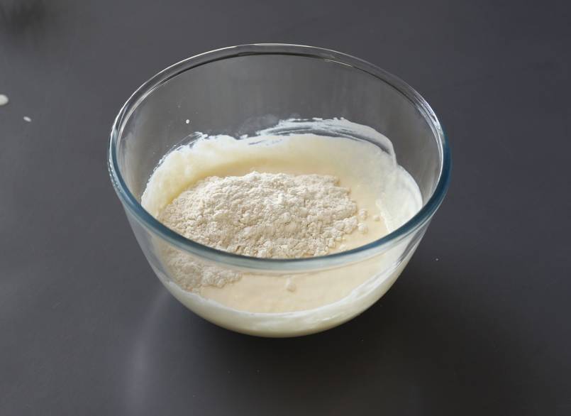 Den Joghurt und das Ei in eine Schüssel geben. Verrühren Sie sie. Dann die anderen Zutaten (Mehl, Hefe und Salz) hinzufügen.