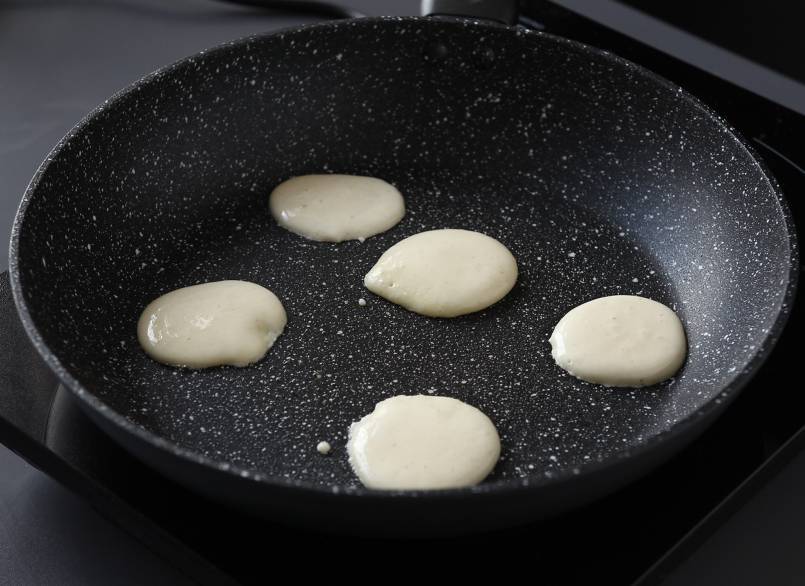 Die Bratpfanne einfetten und auf mittlerer Stufe erhitzen. Sobald sie heiß genug ist, für jeden Blini 1 Teelöffel Teig hineingeben, oder eine größere Menge, wenn Sie es vorziehen.