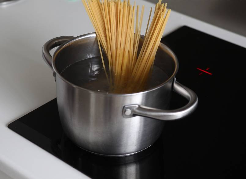 Wasser und Salz in den Topf geben. Sobald es kocht, mit dem Kochen der Nudeln beginnen.