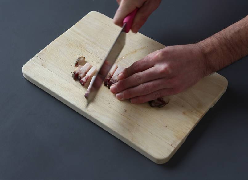 In der Zwischenzeit den Guanciale in Streifen schneiden.