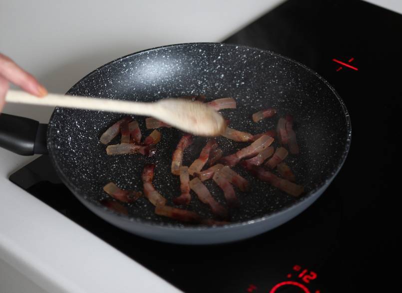 In einer Bratpfanne ohne Zugabe von Fett anbraten. Es ist fertig, wenn es glasig und leicht knusprig ist (Vorsicht, nicht zu lange kochen).