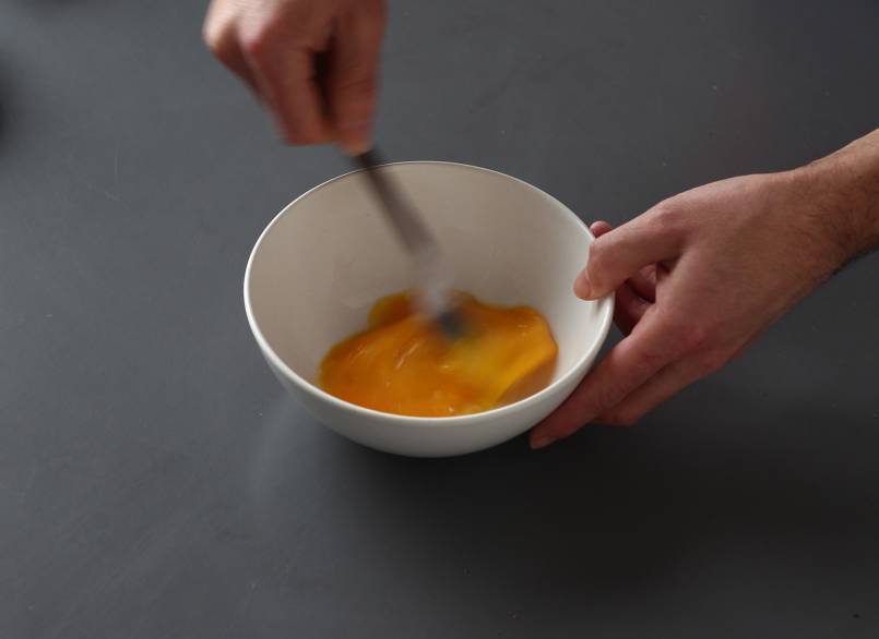 Ein ganzes Ei und ein Eigelb in eine Schüssel geben. Alles wie für ein Omelett verquirlen.