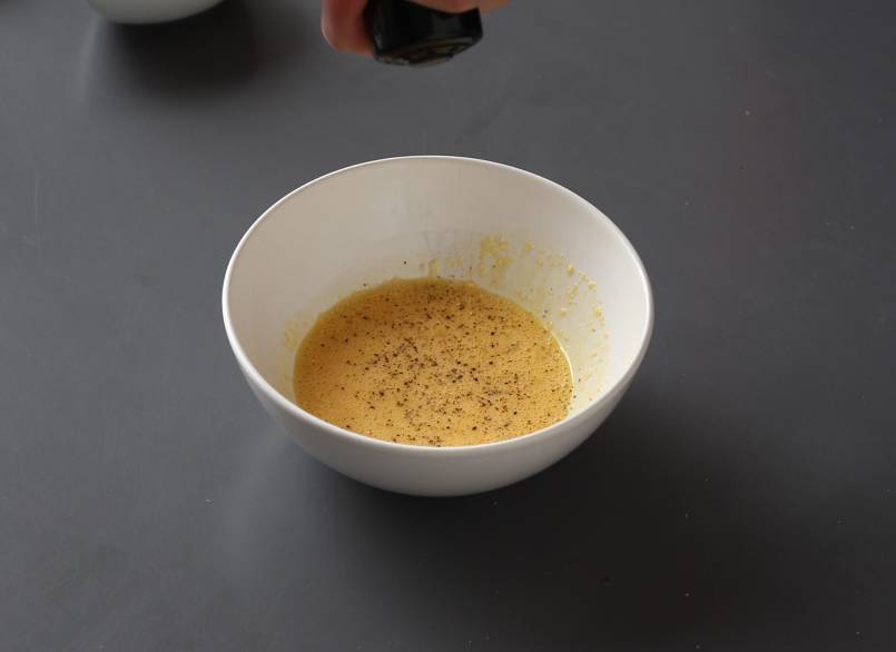 In die Schüssel mit den Eiern ein wenig von dem Fett der Guanciale geben. Nach und nach den gemahlenen Pfeffer und den Käse hinzufügen. Mischen, bis die Masse cremig ist.