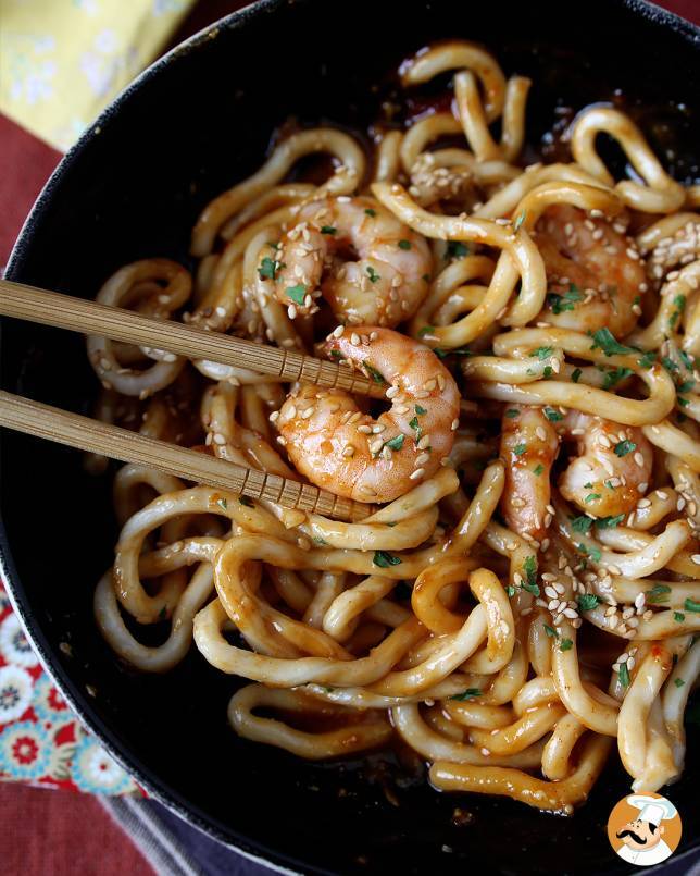 Wenn Sie von einem orientalischen Gericht träumen, das Ihr Herz (und vielleicht auch ein bisschen Ihren Mund!) erwärmt, aber nicht stundenlang am Herd stehen wollen, ist dieses Rezept genau das Richtige für Sie! Udon mit Garnelen und pikanter Erdnusssauce (ausführliches Rezept hier) sind eine Geschmacksexplosion, die Sie sofort überzeugen wird. Sie lassen sich im Handumdrehen zubereiten!