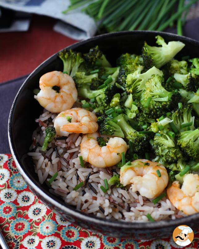 Wenn Sie auf der Suche nach einem gesunden, ausgewogenen und schnell zuzubereitenden Abendessen sind, ist brauner Reis mit Garnelen und Brokkoli(ausführliches Rezept hier) die perfekte Wahl. Sie können es leicht mit anderen Gemüsesorten der Saison abwandeln, so dass das Gericht immer wieder anders ist und Ihrem Geschmack entspricht. Hier schlagen wir eine klassische Version vor, aber wenn Sie den Geschmack intensivieren möchten, können Sie ihn mit einer Sauce anreichern: Teriyaki für eine süß-saure Note oder eine würzige koreanische Sauce für eine kräftigere Note.