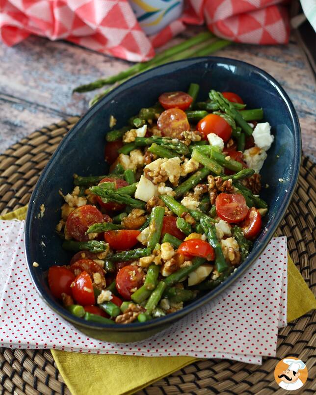 Sie suchen nach einer frischen, schnellen und nahrhaften Idee für Ihre täglichen Mahlzeiten? Dieser Spargel-Feta-Walnuss-Salat ist die perfekte Lösung für alle, die sich gesund ernähren wollen , ohne Zeit in der Küche zu verschwenden. Voller Geschmack und in weniger als 20 Minuten zubereitet, ist er ideal als Teil eines intelligenten Wochenplans für alle, die wenig Zeit haben, aber nicht auf gesunde, ausgewogene Mahlzeiten verzichten wollen. Dieses Rezept eignet sich perfekt als schmackhafte Vorspeise, aber auch als leichtes Hauptgericht für ein schnelles Mittagessen oder ein Abendessen in letzter Minute. Es kombiniert die Knackigkeit des Spargels mit der Würze des Fetakäses und der rustikalen Note der Walnüsse.