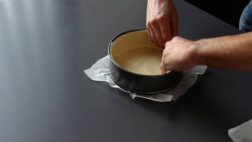 Den Blätterteigboden einlegen: Eine Scheibe Blätterteig in der Größe des Bodens der Backform ausschneiden und vorsichtig einlegen.
