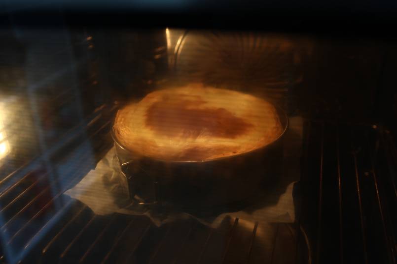 Backen: Die Torte bei 180°C (vorgeheizter Ofen) etwa 35 Minuten backen, bis die Oberfläche goldbraun ist.