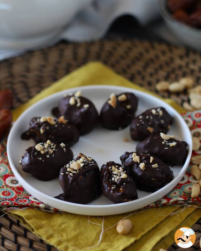 Vollständiges Rezept ❘ Snickers: Gefüllte Datteln mit Schokoladenüberzug