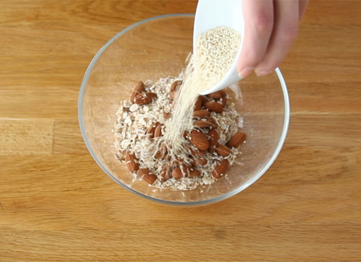 Mischen Sie Haferflocken, Mandeln und Sesam in einer großen Schüssel. Diese Zutaten bilden die knusprige Grundlage für Ihr selbstgemachtes Granola.