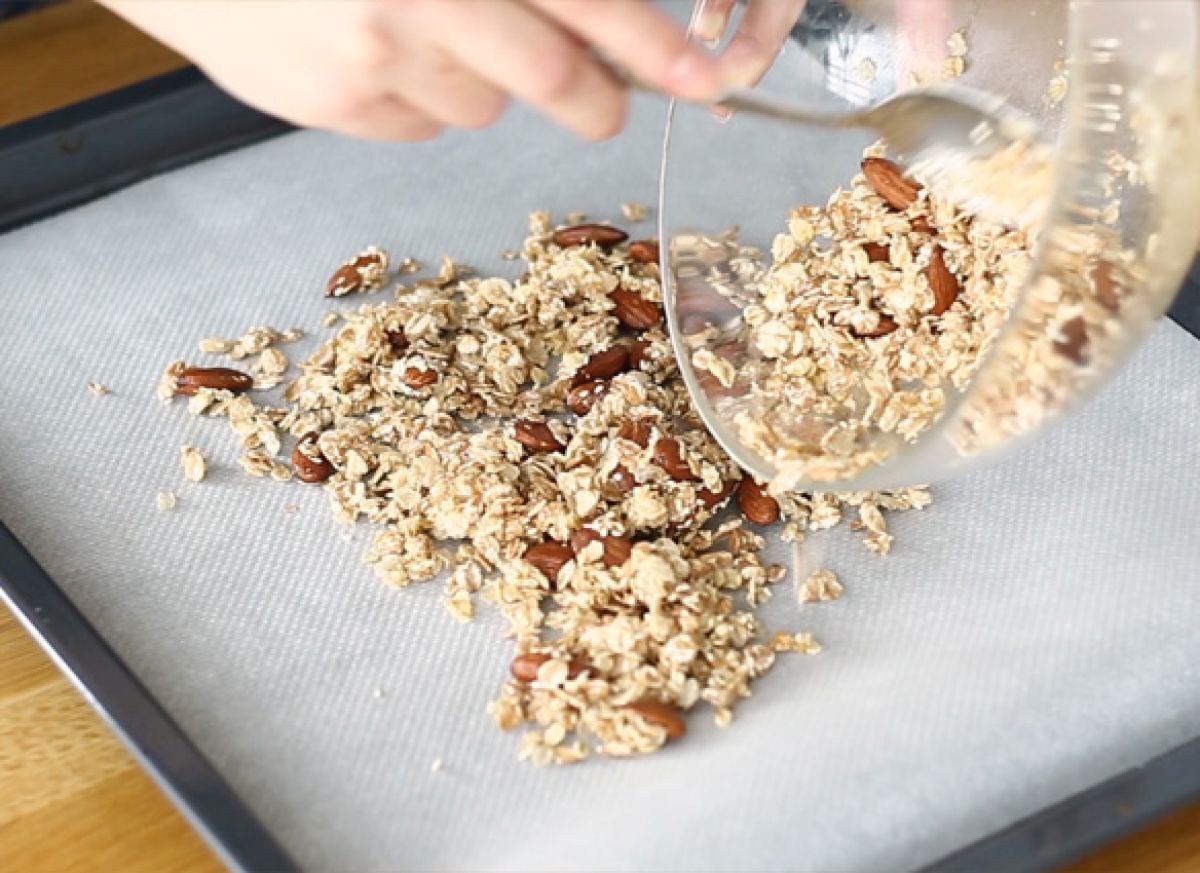 Ein Backblech mit Backpapier auslegen und die Mischung gleichmäßig in einer etwa 1 cm dicken Schicht verteilen. Dieser Schritt ist wichtig, um ein gleichmäßiges Backen und knuspriges Granola zu gewährleisten.