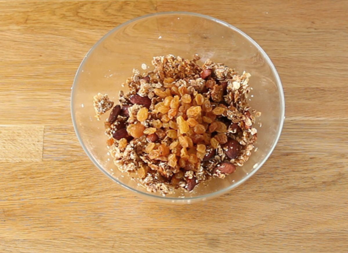Lassen Sie das Müsli nach dem Kochen vollständig abkühlen. Dann die Sultaninen hinzufügen und gut mischen.