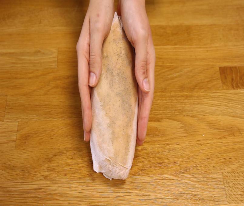 Die Stopfleber salzen und pfeffern und dann in zwei Gazen einwickeln, wobei sie zusammengedrückt wird, damit sie eine zylindrische Form erhält.