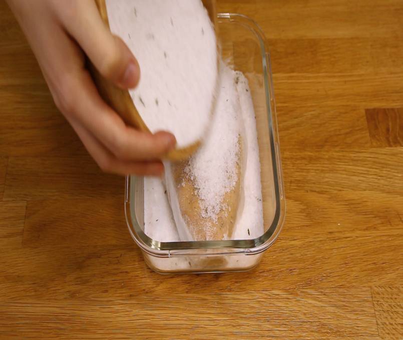 Grobes Salz, Zucker und Thymian mischen und die Hälfte der Mischung in die Schüssel geben. Die Foie gras darauf legen und mit der anderen Hälfte der Mischung bedecken. Filtern und mindestens 36 Stunden kühl stellen.