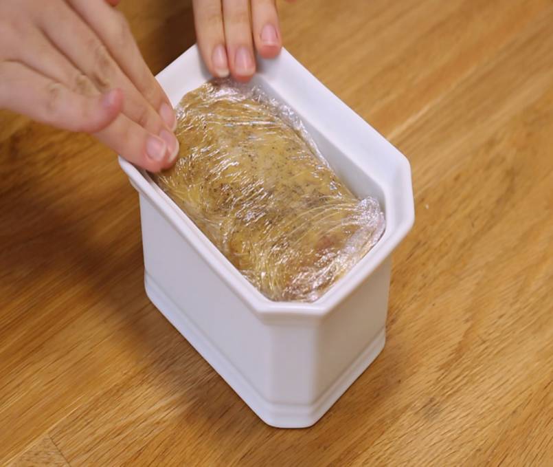 Die Foie gras aus der Gaze nehmen und in Frischhaltefolie wickeln, dann in eine Terrine legen. 12 Stunden kühl stellen.