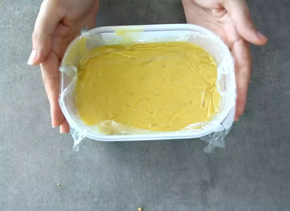 Das Mangopüree mit dem abgekühlten Boden vermischen. Die Mischung in einen Eisbecher füllen, mit Frischhaltefolie abdecken und für mindestens 3 Stunden in den Gefrierschrank stellen.