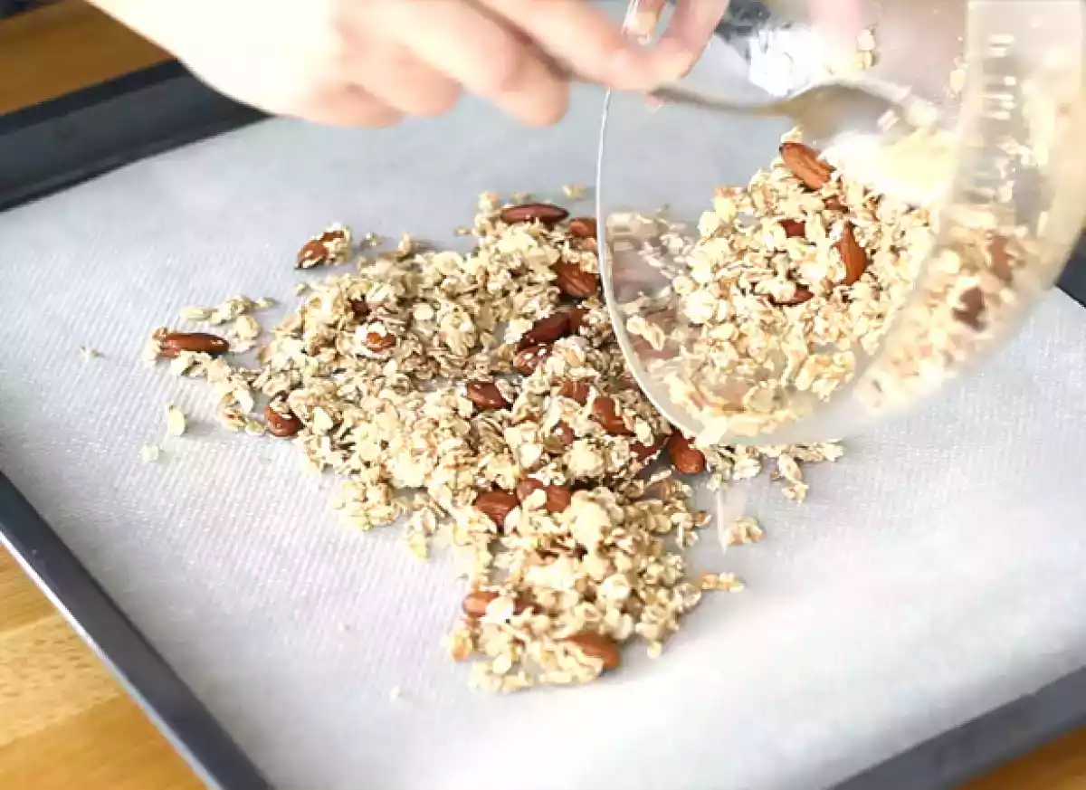 Ein Backblech mit Backpapier auslegen und die Mischung gleichmäßig in einer etwa 1 cm dicken Schicht verteilen. Dieser Schritt ist wichtig, um ein gleichmäßiges Backen und knuspriges Granola zu gewährleisten.