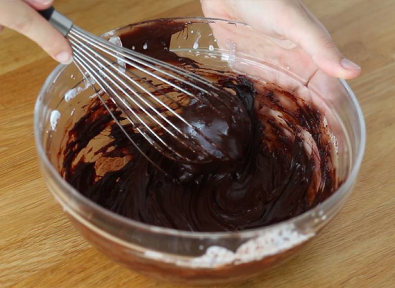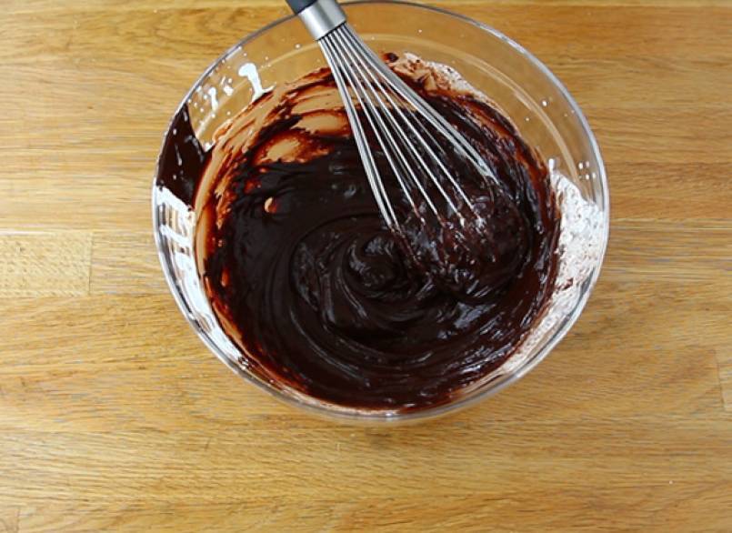 • Die Sahne aufkochen und in die Schüssel mit der geschmolzenen Schokolade gießen. Mit einem Schneebesen gut verrühren.