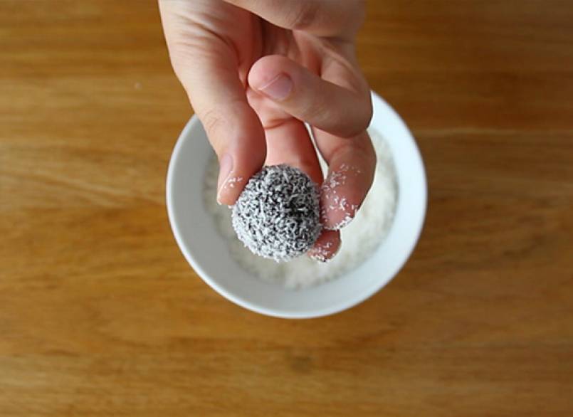 • Eine Trüffel in Kokosraspeln, eine andere in Kakao, Perlen und Schokoladenstreuseln wälzen.
