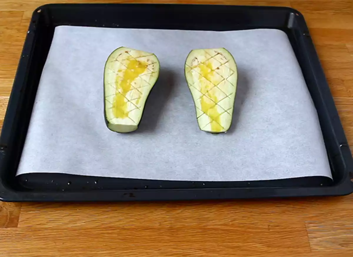 Die Aubergine der Länge nach in zwei Hälften schneiden. Die Stücke mit der Hautseite nach unten auf das bereits mit Backpapier belegte Backblech legen. Die Oberseite (schachbrettartig) ausschneiden und mit Olivenöl bestreichen.