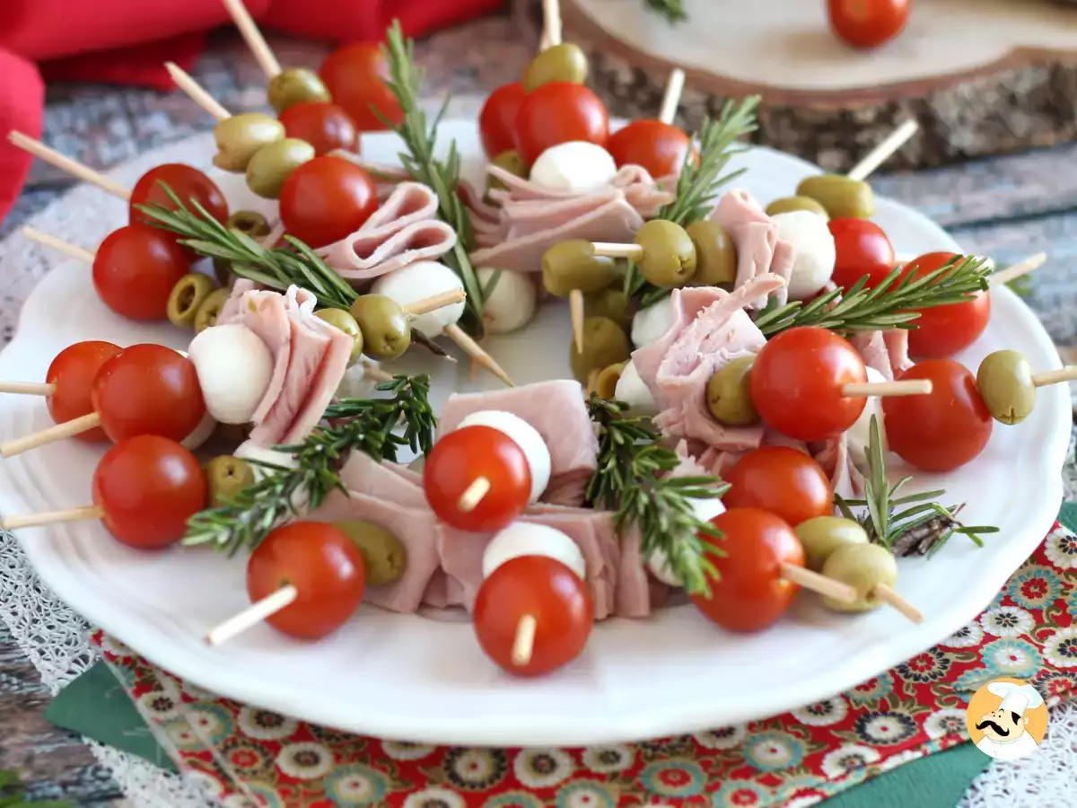 - Die Spieße kreisförmig um einen flachen Teller herum anordnen. Wenn Sie möchten, können Sie eine zweite Schicht hinzufügen, um mehr Volumen zu erhalten. Vervollständigen Sie die Präsentation, indem Sie die Spieße mit Rosmarinzweigen dekorieren, die für Farbe und einen festlichen Touch sorgen.