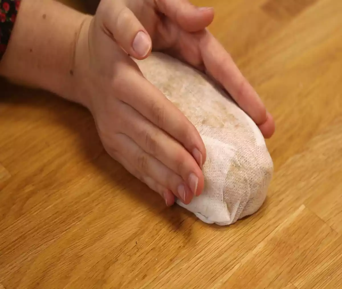 Die Stopfleber salzen und pfeffern und dann in zwei Gazen einwickeln, wobei sie zusammengedrückt wird, damit sie eine zylindrische Form erhält.