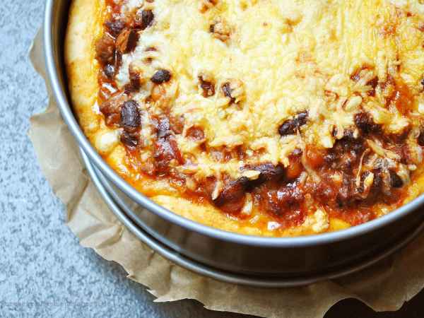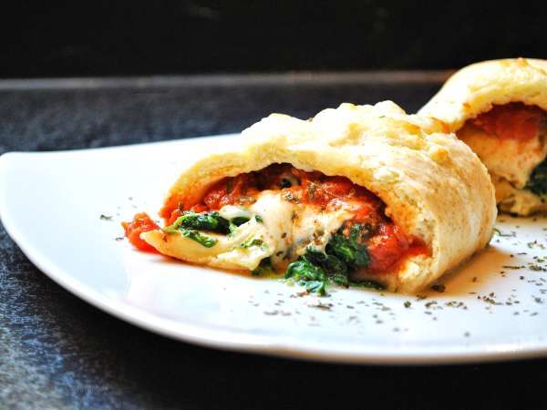 Vegetarische pizzarolle mit spinat, tomaten & büffelmozzarella