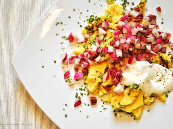 Gezupfter kräuterpfannkuchen mit gebratenen radieschen