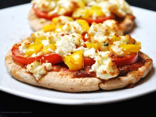 Vegetarische pita-pizzen mit paprika, tomaten & schafskäse