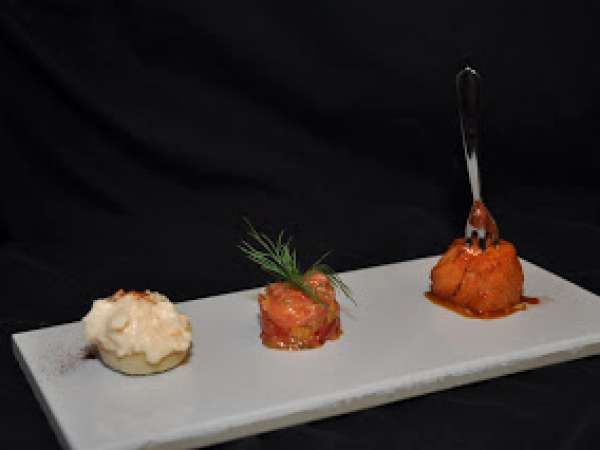 Salmon three ways (mousse / tartar with ginger / cooked in caramel)