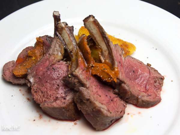 Rosa gebratene lammkrone mit kräuterbutter und polenta