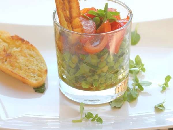 Sommerlicher zuckerschoten-erbsen-minze-salat mit lauwarmen tomaten